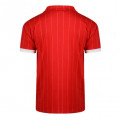 Das rote Retro Heimtrikot besticht durch die schmalen weißen vertikalen Streifen und die weißen Akzente an Kragen und Ärmeln.